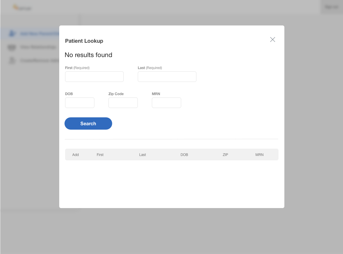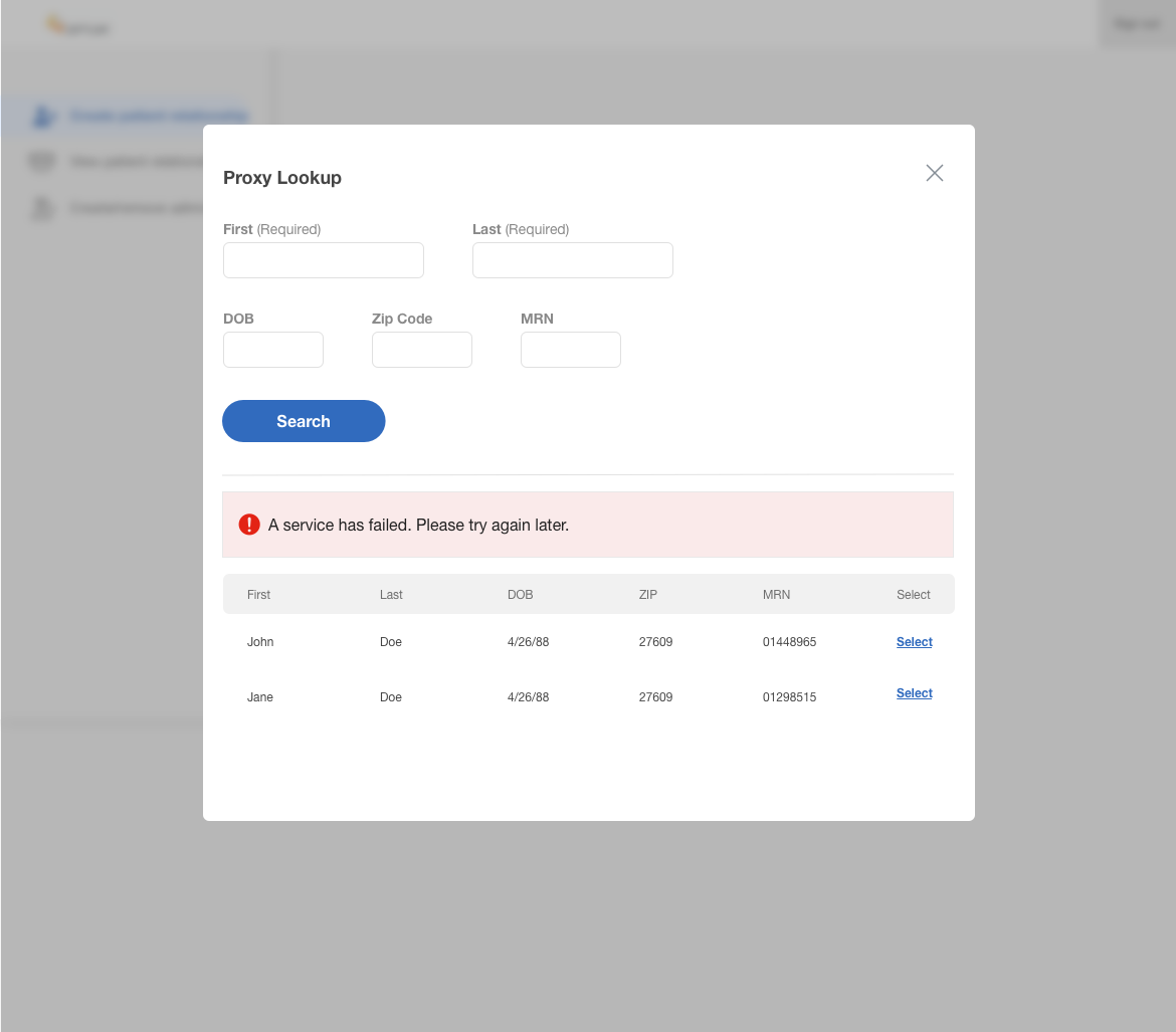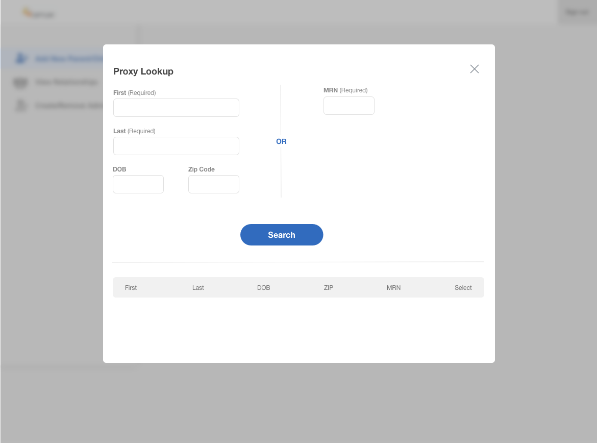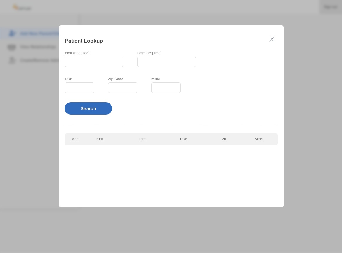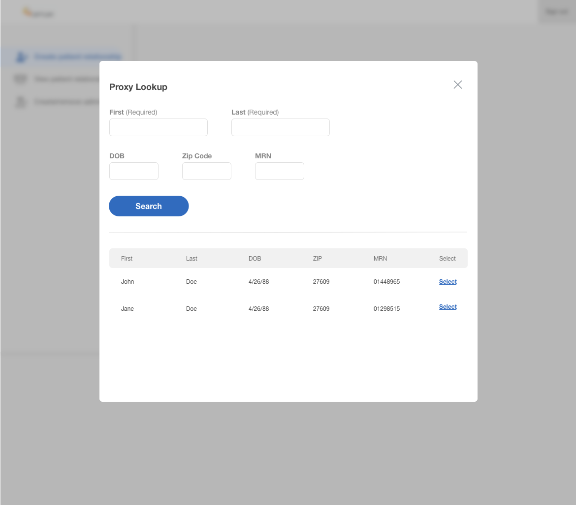 This first set of screens is specifically concerned with finding the appropriate patients and their proxies and creating a relationship between them.